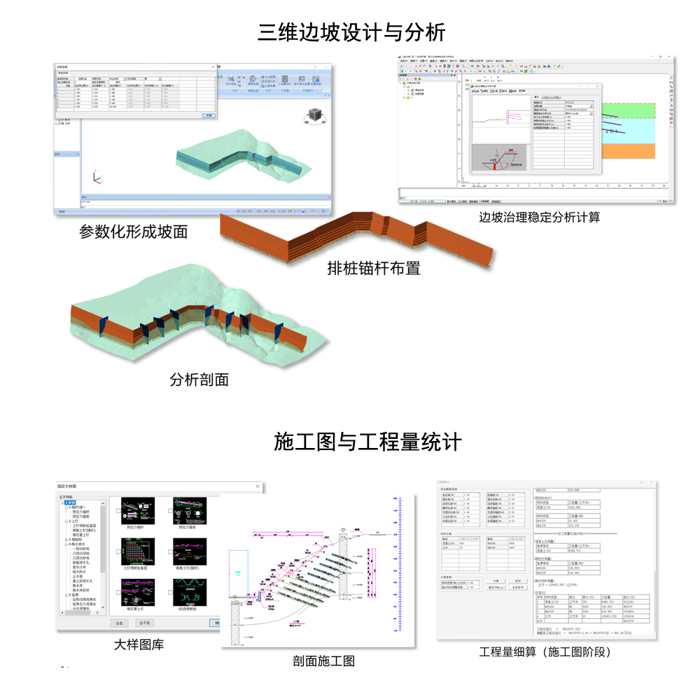 软件基于自主可控的理正土木工程三维建模图形平台,集三维边坡设计、分析、施工图、数字化交付于一体的设计软件,可以实现二、三维联动,在三维地质模型为基础上进行放坡、支护、排水等边坡全要素设计,实现边坡稳定性分析,生成边坡施工图以及工程量统计,设计成果支持数字化交付。